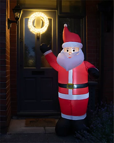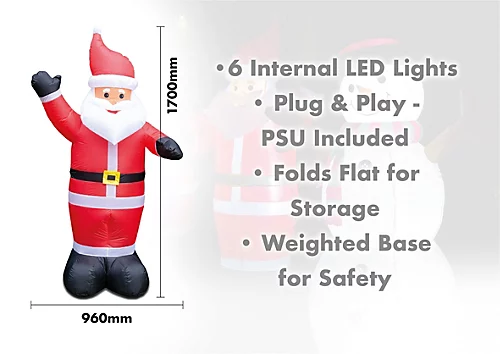 Delight your family and neighbours this festive season with the charming 170cm inflatable Father Christmas from St Helens Home & Garden. Everything you need is supplied, simply plug him in and watch him inflate, it couldn’t be easier. The Father Christmas features internal pre-assembled LED lights to make Christmas that little bit more magical. Supplied with an internal fan, 12V power adaptor, safety ropes and 2 pegs to help anchor it to the ground in inclement weather, the base is also weighted for extra safety, a zip compartment allows you to add extra weight if necessary. When the sad day arrives and Christmas is over simply fold him flat and pack him away in his box until next year. Made from 100% polyester. For either indoor or outdoor use.