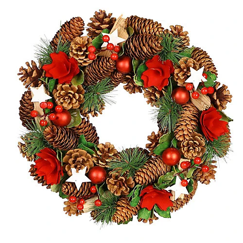 - Decorated with a real pinecones, shooting stars, red flora roses, red baubles and clusters of bright berries