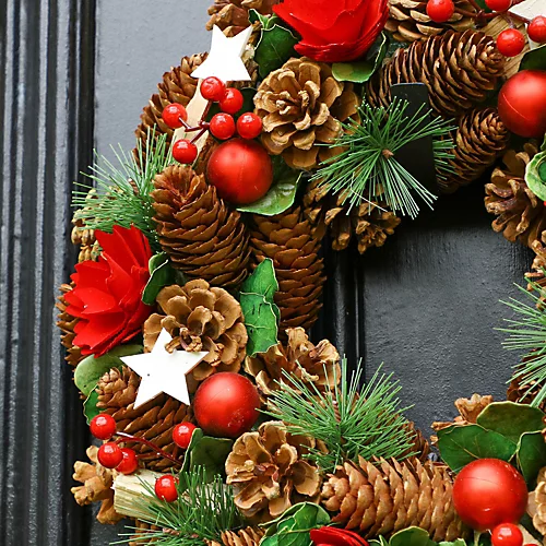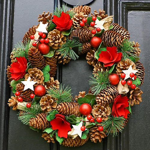 A more natural alternative, this Christmas Door Wreath is finished in traditional festive shades of red and white and green. Hand-made with real pinecones creating a beautiful densely packed display, nestled with white wooden shooting stars, wooden red flora roses, hand polished red baubles and clusters of bright berries.