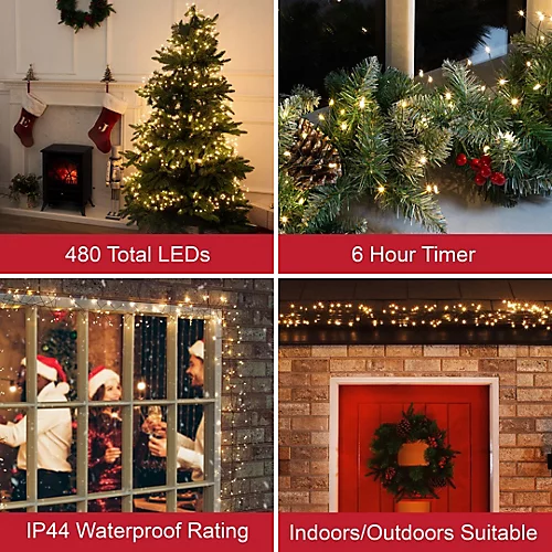 Light up your home this Christmas with these green cluster string lights. The 480 warm white micro-LED lights utilise a festive and wintery green colouring and provide all the illumination you need to decorate your home this festive season! These static Christmas lights are perfect for indoor and outdoor use, but please note that if being used outdoors then the transformer needs to remain INSIDE and dry at all times. Decorate your Christmas tree, living rooms & conservatories or bedrooms with ease. These festive Christmas lights are mains operated and feature a 5-metre gap between the power source and the 3 metres of warm white LED lights. The LEDs are non-replaceable, and the cable colour is festive green, adding to the majesty of the Christmas decoration. As well as being fantastic lights to decorate the Christmas tree, these static fairy lights are also perfect to be used at weddings, birthday parties and any other events where decorative illumination is required.