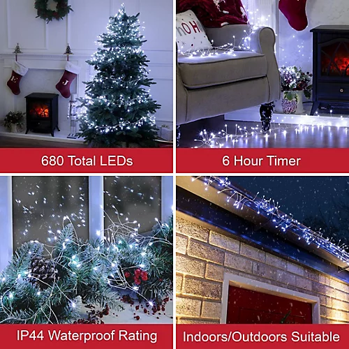Light up your home this Christmas with these silver cluster string lights. The 680 warm white micro-LED lights utilise a festive and wintery silver colouring and provide all the illumination you need to decorate your home this festive season! These static Christmas lights are perfect for indoor and outdoor use, but please note that if being used outdoors then the transformer needs to remain INSIDE and dry at all times. Decorate your Christmas tree, living rooms & conservatories or bedrooms with ease. These festive Christmas lights are mains operated and feature a 5-metre gap between the power source and the 3 metres of warm white LED lights. The LEDs are non-replaceable, and the cable colour is festive silver, adding to the majesty of the Christmas decoration. As well as being fantastic lights to decorate the Christmas tree, these static fairy lights are also perfect to be used at weddings, birthday parties and any other events where decorative illumination is required.