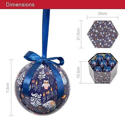 This fantastic box set of 14 baubles will beautifully decorate your Christmas tree this festive season. The baubles feature a navy background and a charming flora and fauna design that will appeal to people of all ages. These Christmas baubles feature a unique design including swirling plants and flowers in addition to various cute animals including owls, raccoons, birds, and hares. These 14 baubles are made from recycled polyfoam and come collectively packaged in a wonderfully festive gift box that can act as a storage space once the tree comes down in January. The gift box measures 25 x 22 x 16cm. Each of the 14 individual baubles measure 7.5cm in circumference, making them the perfect size to sit eloquently yet stand out on your Christmas tree. Their lightweight design prevents them from weighing down the branches and their individual ribbons makes it easy to attach and detach each bauble from your tree.